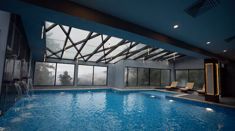 A mountain retreat with every luxury imaginable: spas, pools, mountain views, and even an indoor cinema to lounge in.